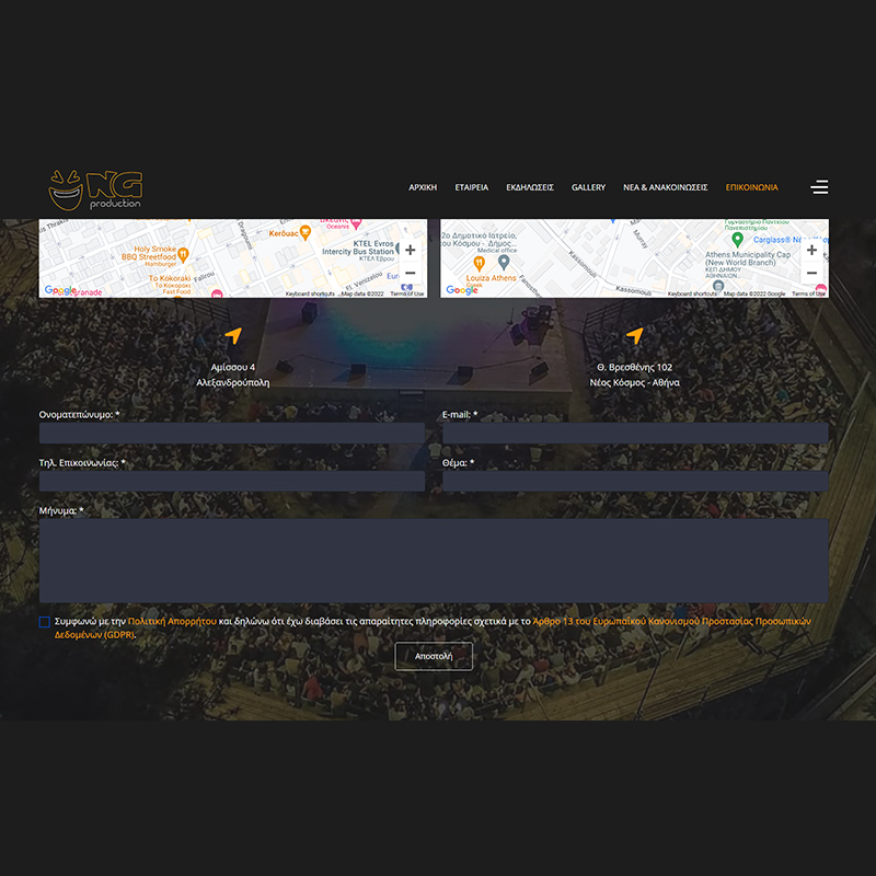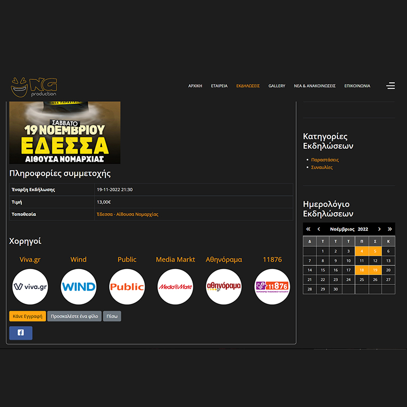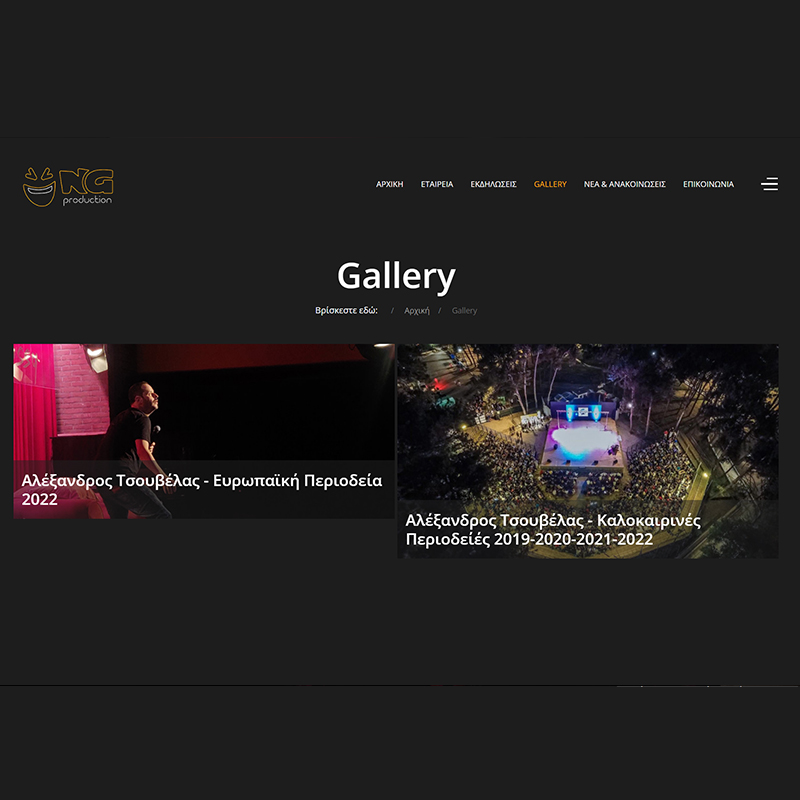 NG Productions, entrusted us with the development of their professional website, with scope the presentation of the offered services, the events they are organising and producing. Also they asked for a booking system for the upcoming events in order to book tickets.
