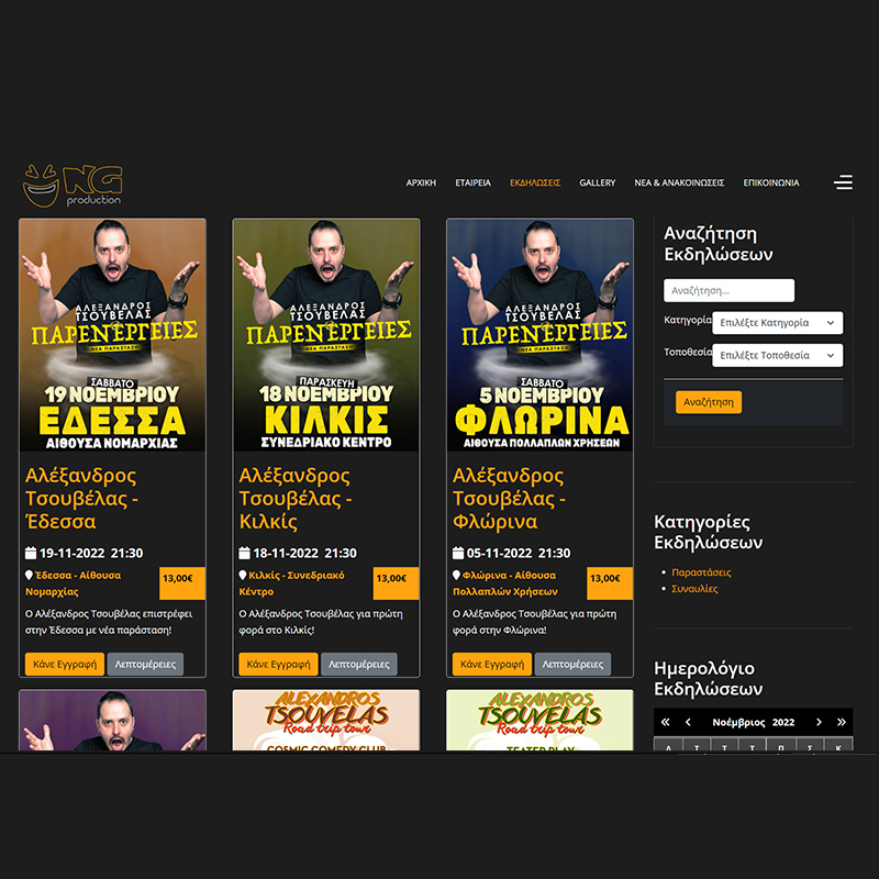NG Productions, entrusted us with the development of their professional website, with scope the presentation of the offered services, the events they are organising and producing. Also they asked for a booking system for the upcoming events in order to book tickets.